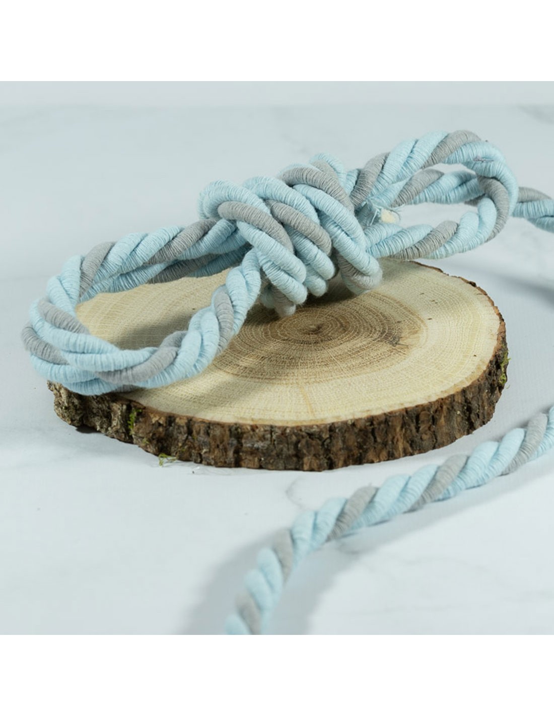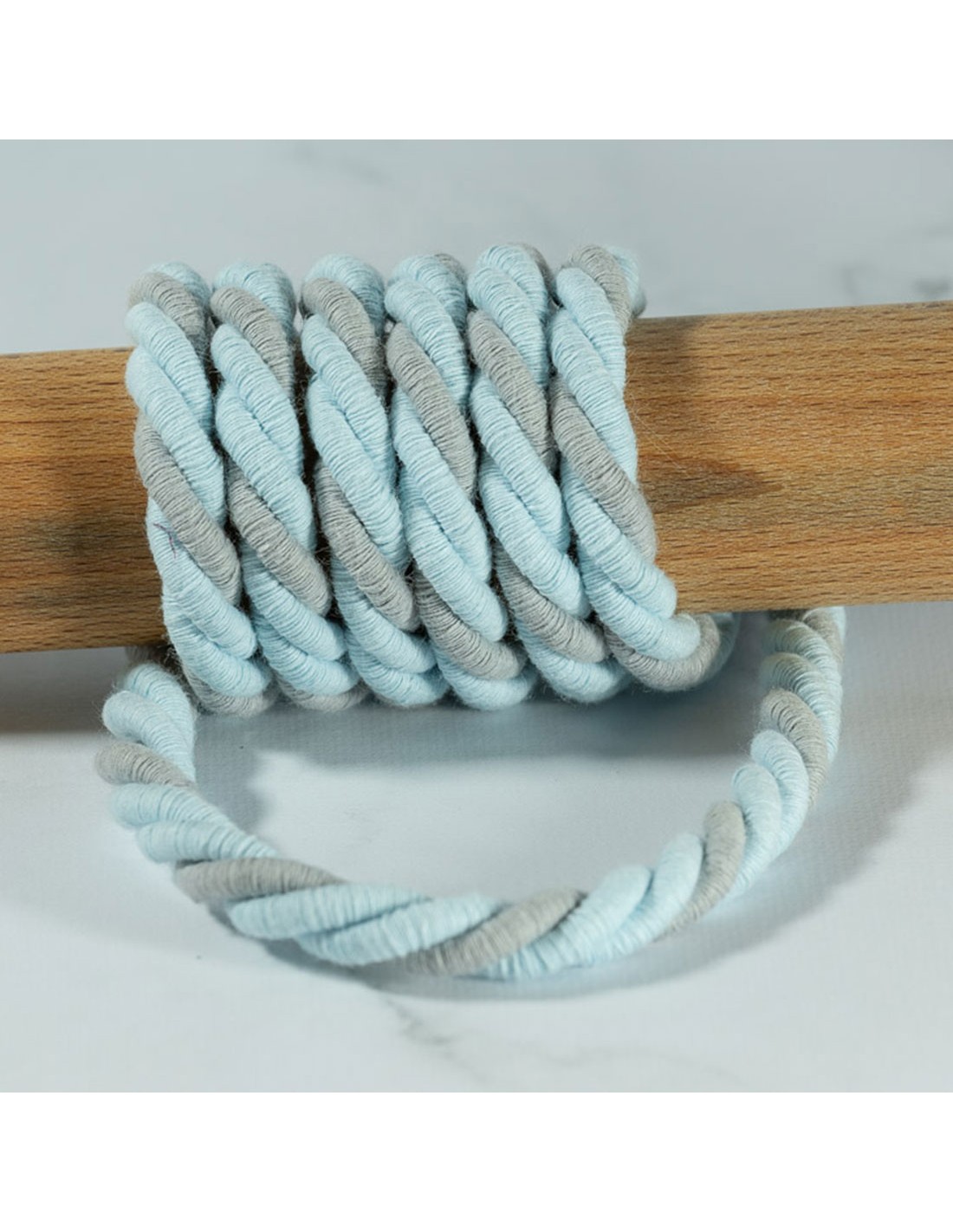 Cordon de coton torsadé, tenue rigide, bleu ciel et gris clair (10mm)