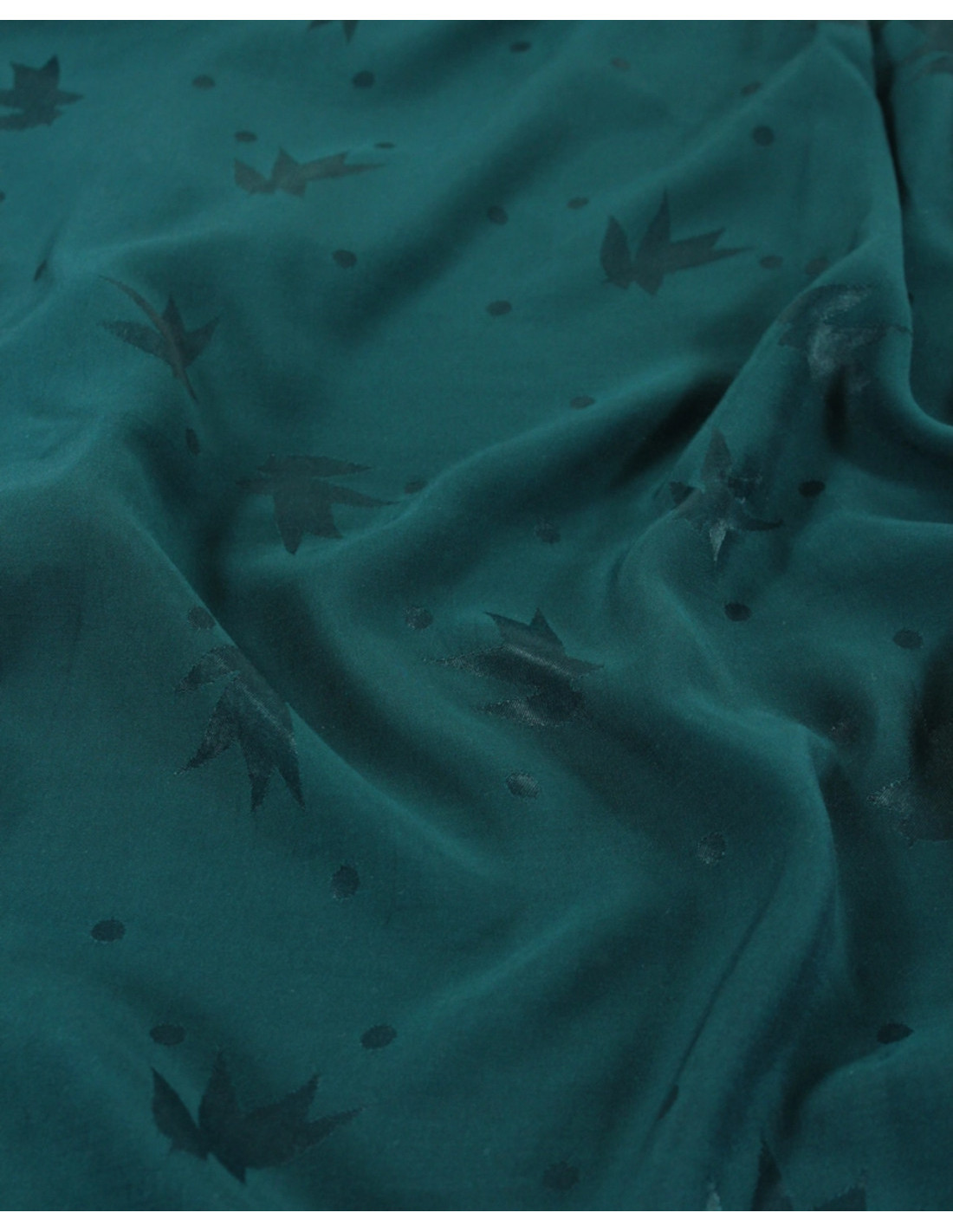 On adore cet effet faux-uni, mettant en avant des pois et des silhouettes de feuilles par un jeu de tissage aux contrastes mats et satinés !