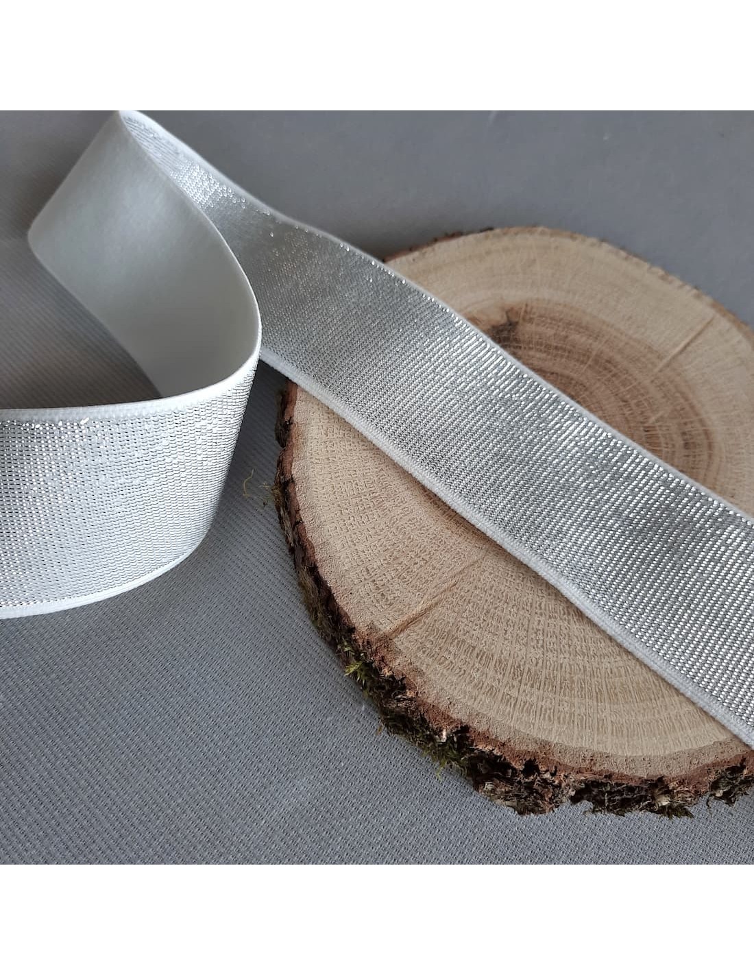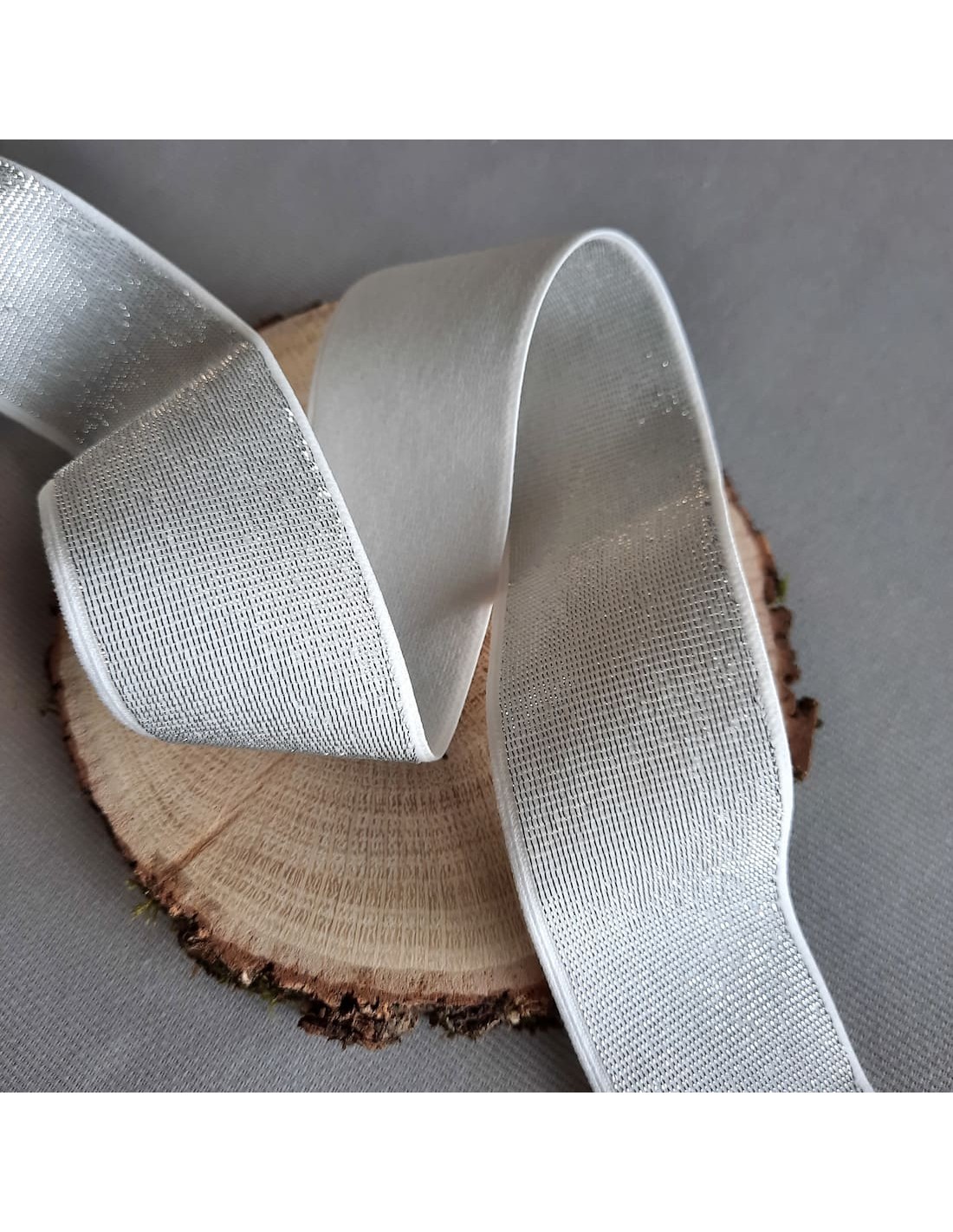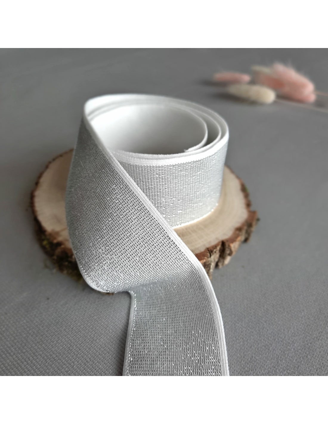 Elastique fantaisie de 4 cm de large, agréable à porter à même la peau car doux à l'intérieur et au lurex brillant argenté à l'extérieur. De quoi sublimer la ceinture d'un jogging, boxer, jupe à taille élastiquée ou tout autre vêtement où l'élastique doit être visible !