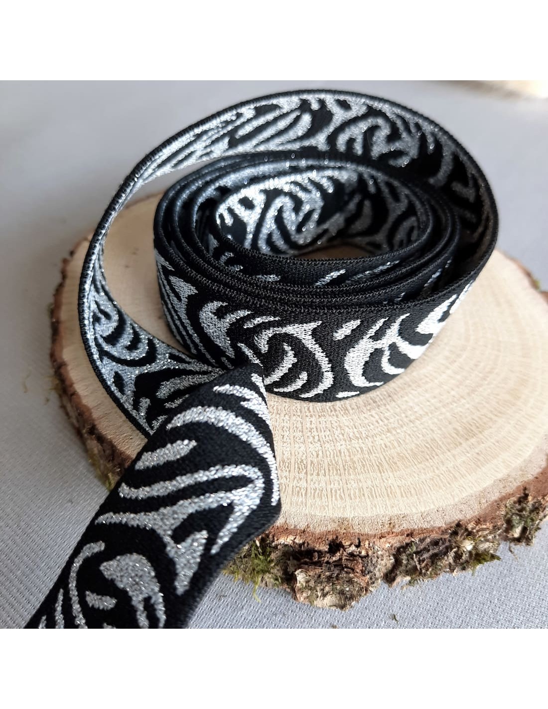 Elastique fantaisie à motifs double face de 2 cm et demi de large, au lurex brillant argenté et élastique noir. De quoi sublimer une simple jupe à taille élastiquée ou tout autre vêtement où l'élastique doit être visible !