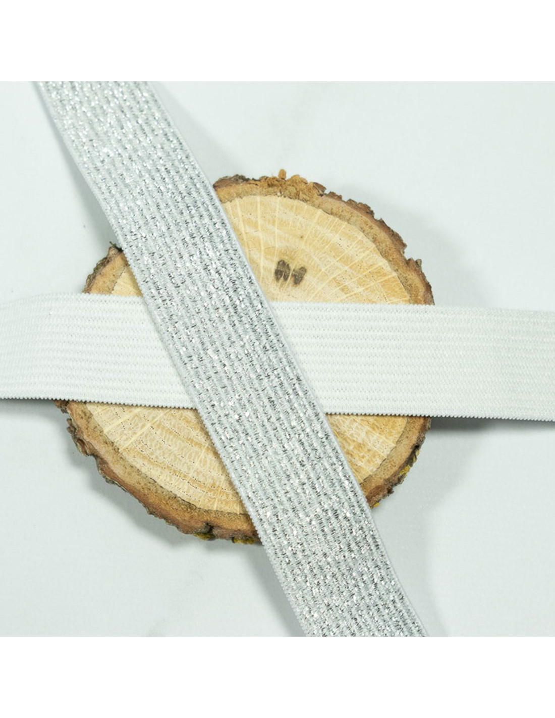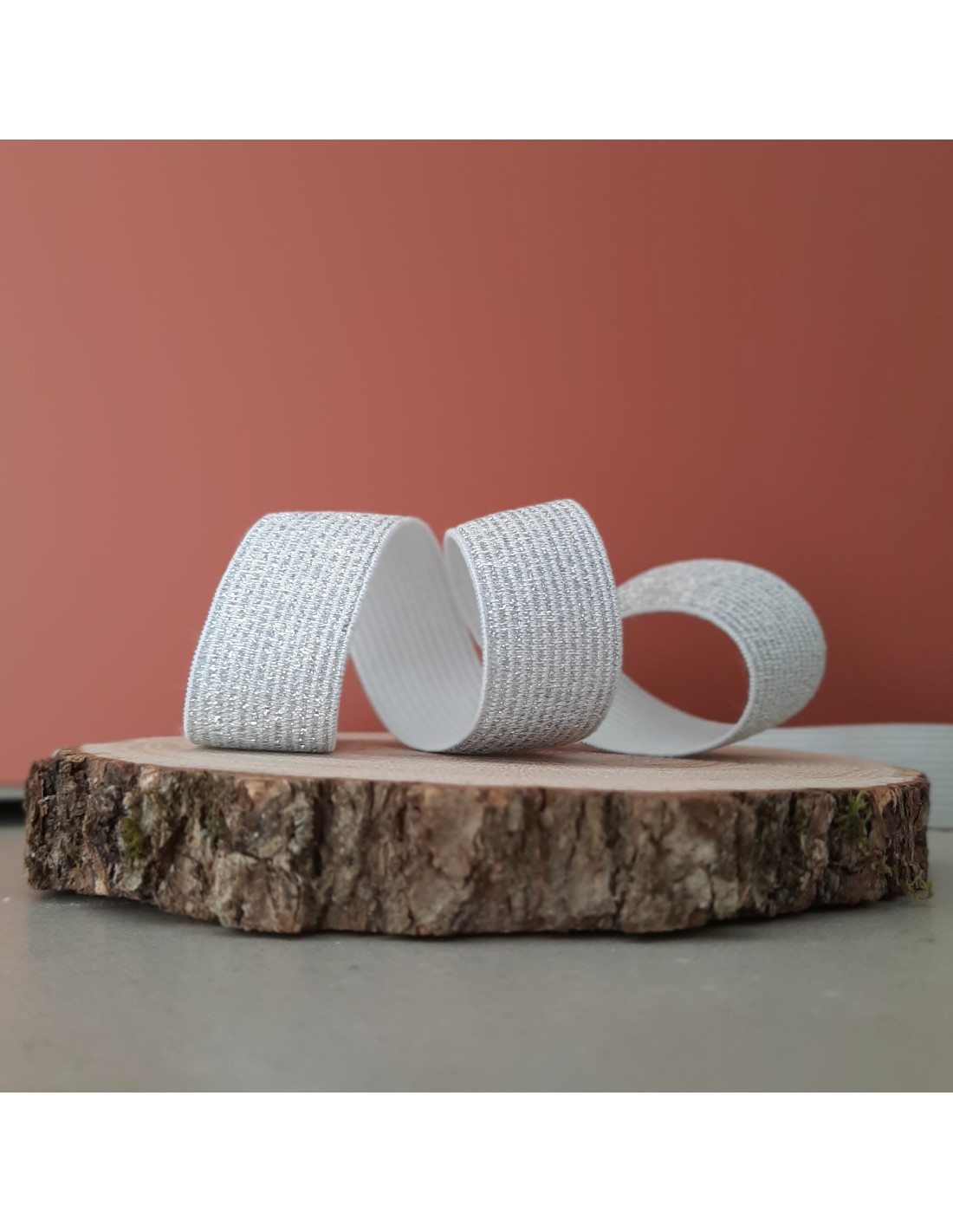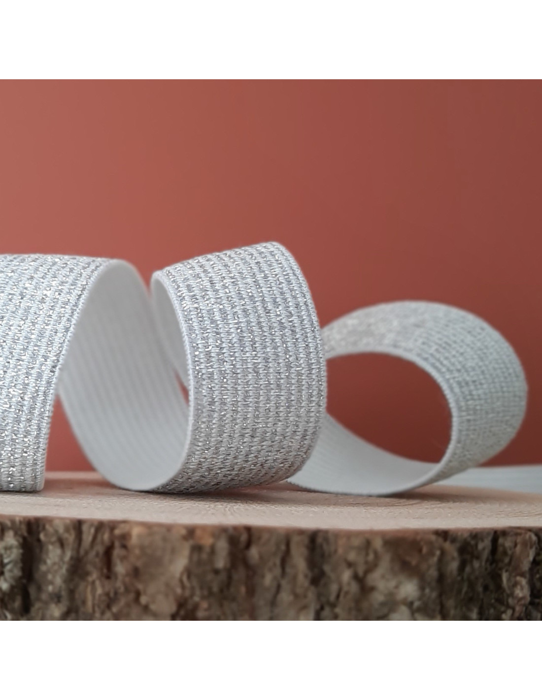 Elastique fantaisie de 2 cm de large à fines lignes blanches et argentées à l'extérieur et tout blanc à l'intérieur. De quoi sublimer la ceinture d'une culotte, une petite jupe à taille élastiquée ou tout autre vêtement où l'élastique doit être visible !
