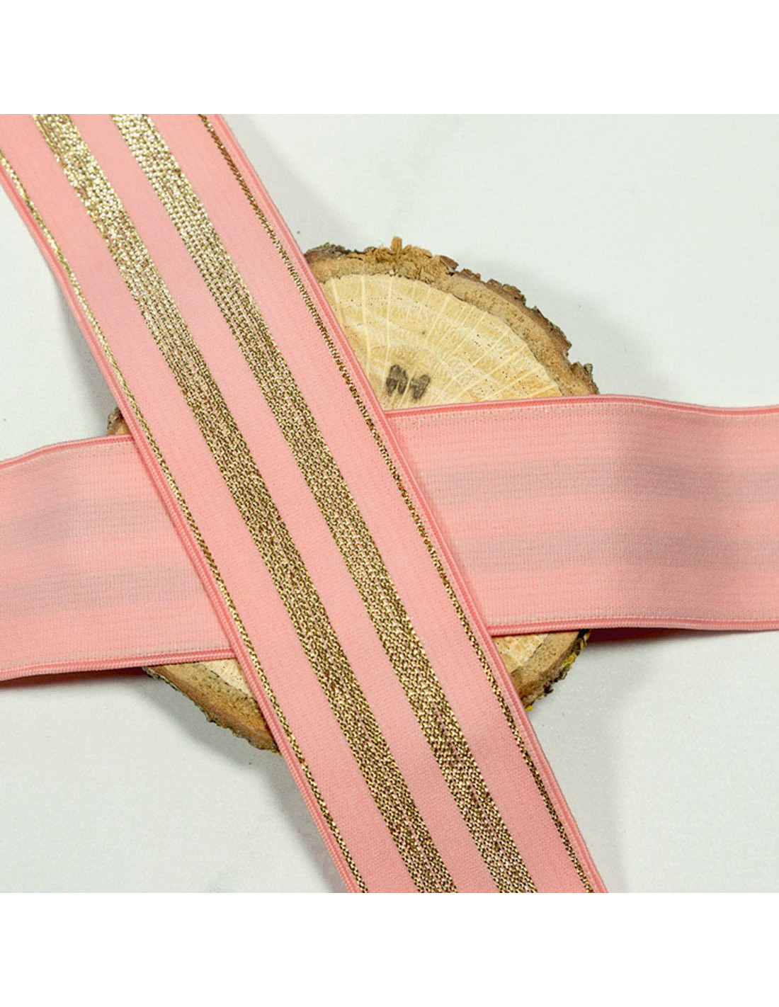 Elastique fantaisie de 3 cm de large à bandes dorées et roses à l'extérieur et à l'intérieur rose particulièrement doux. De quoi sublimer la ceinture d'une culotte, un petit jogging ou jupe à taille élastiquée ou tout autre vêtement où l'élastique doit être visible !