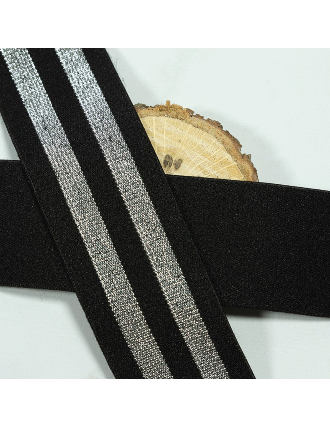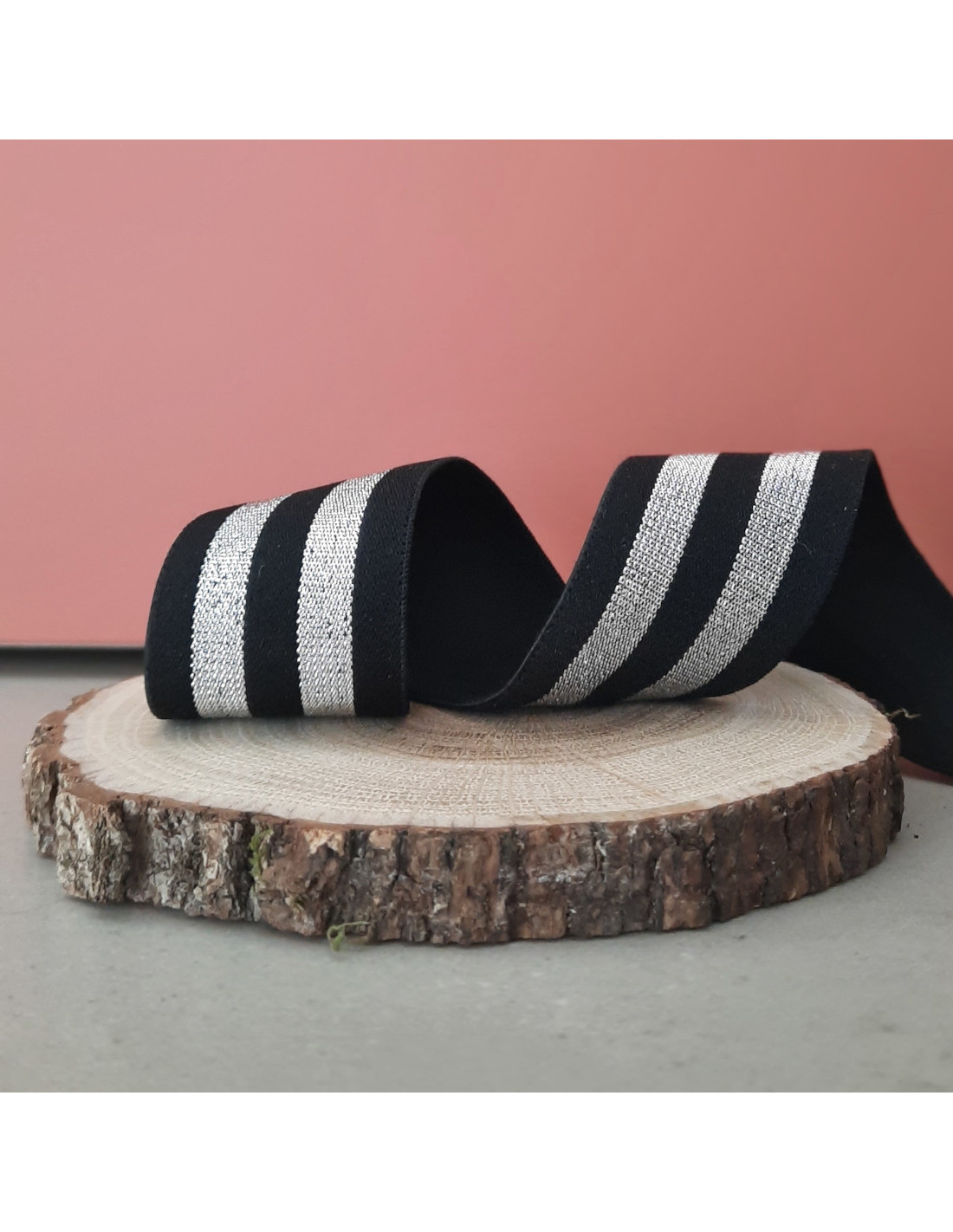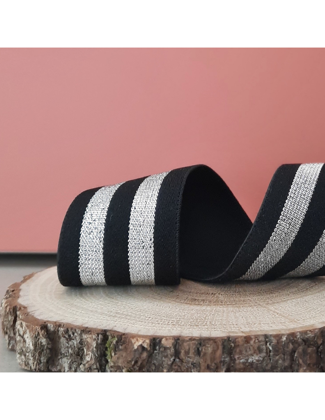 Elastique fantaisie de 4 cm de large à bandes argentées et noires à l'extérieur et à l'intérieur noir. De quoi sublimer la ceinture d'un jogging, boxer, jupe à taille élastiquée ou tout autre vêtement où l'élastique doit être visible !
