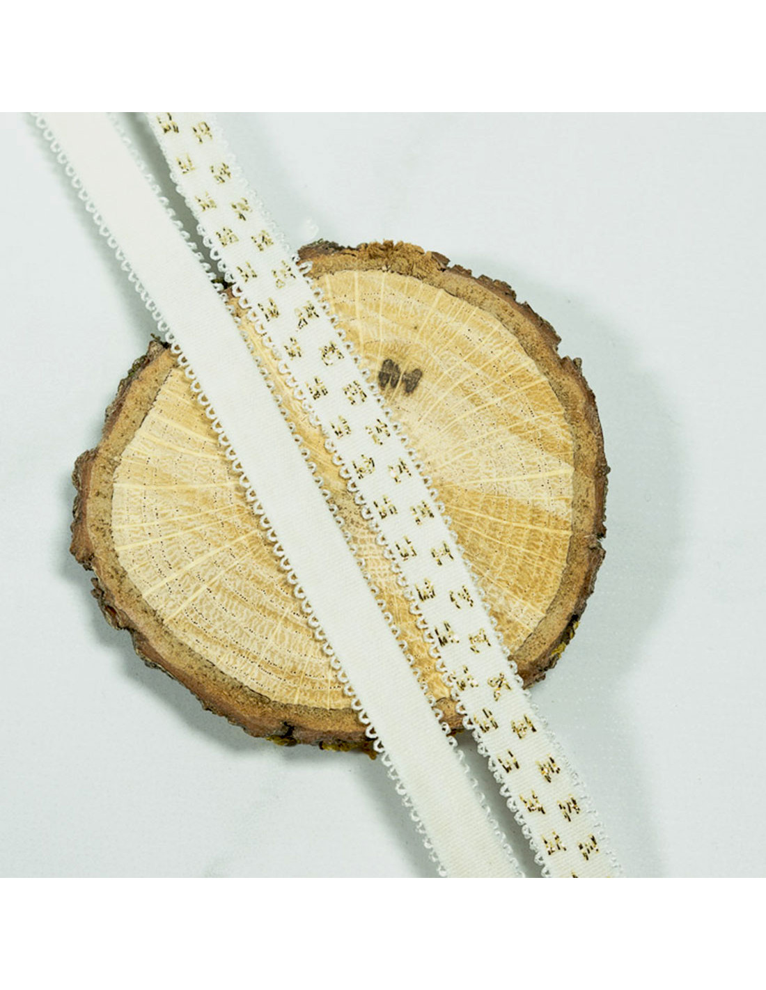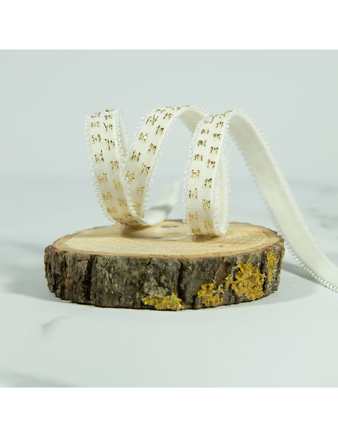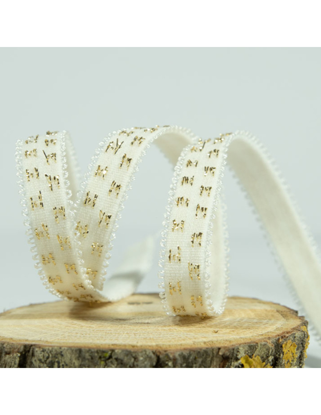 Elastique tissé de 1cm de large avec un endroit qui scintille de petites croix dorées et une deuxième face unie pour pouvoir être en contact avec la peau. Une jolie bordure dentellée vient finir les bords.