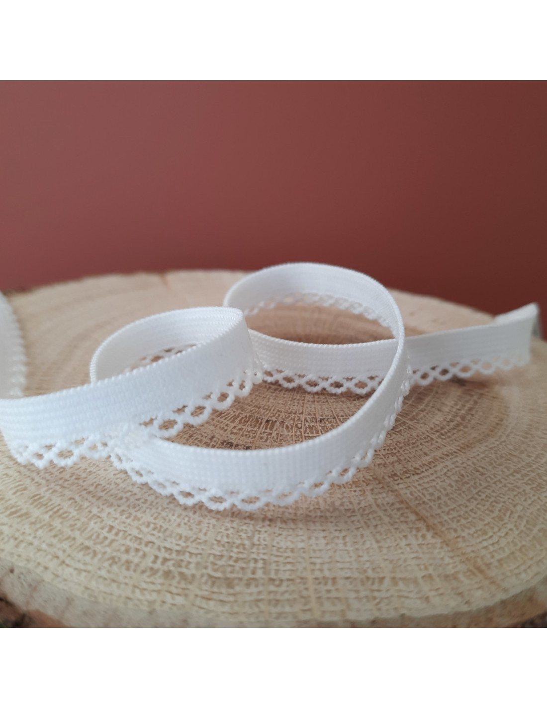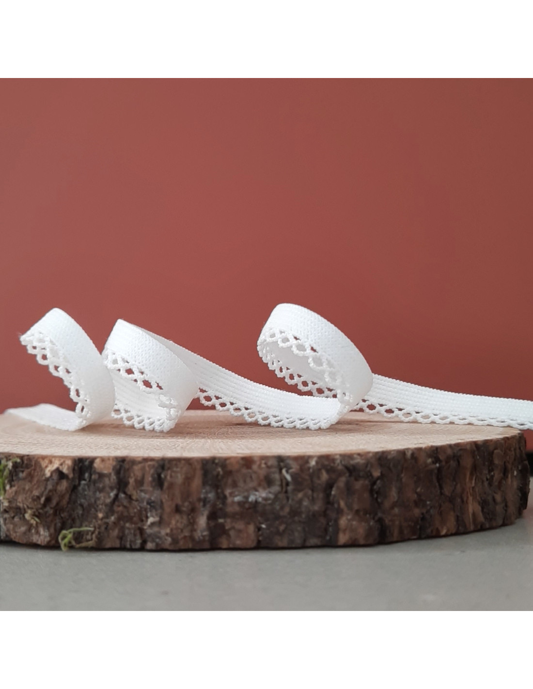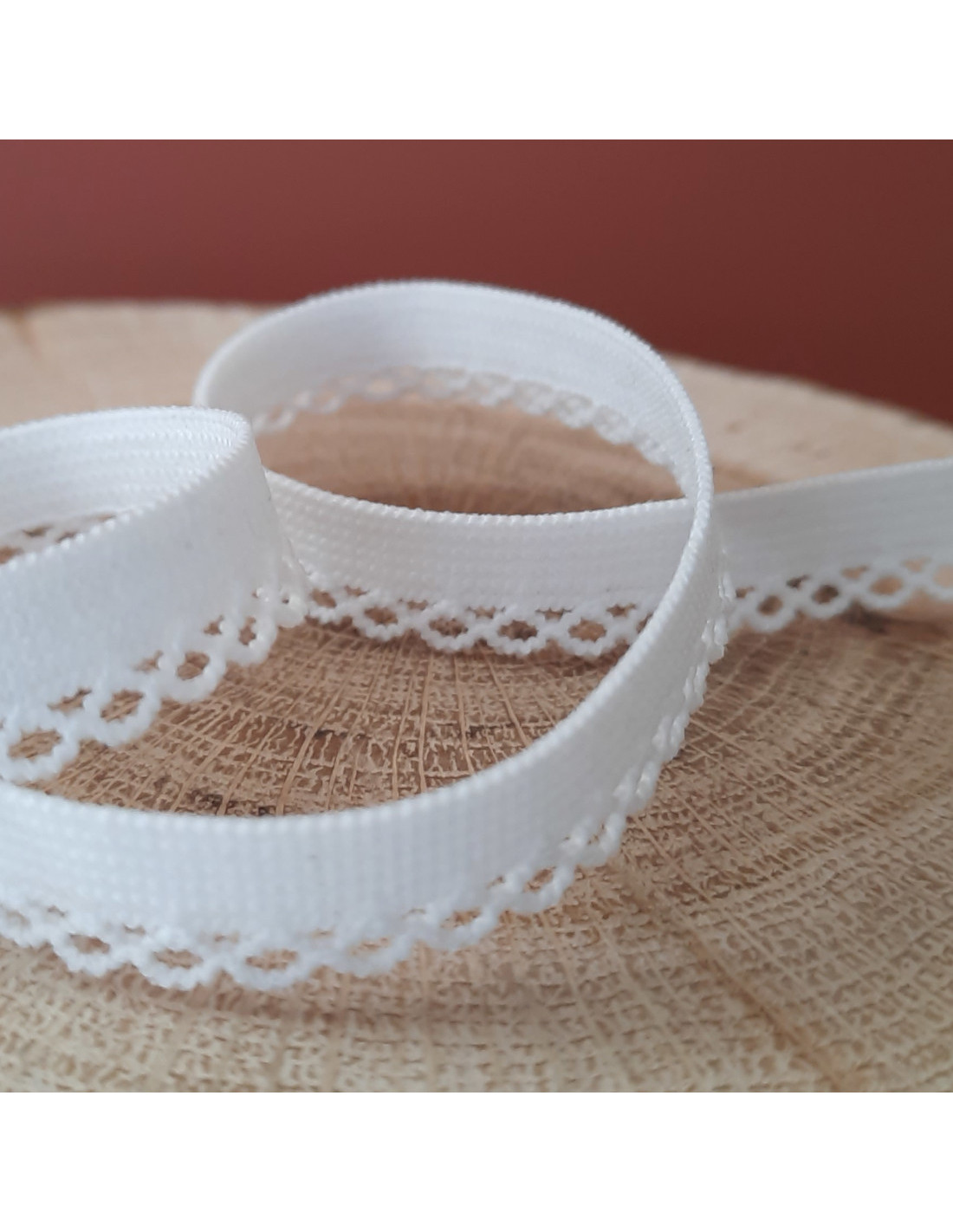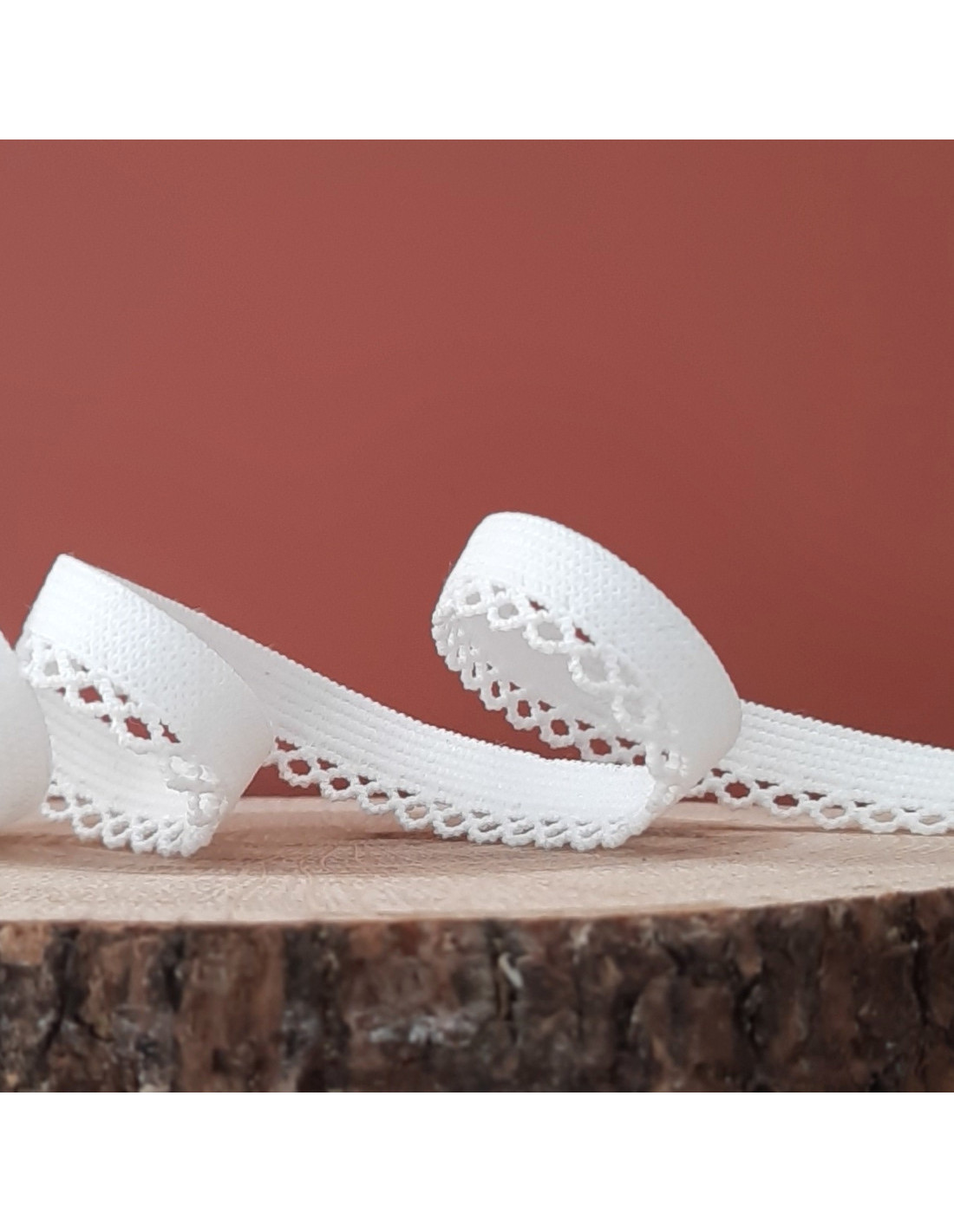 Elastique festonné de 1cm de large avec une belle élasticité (environ 70%), blanc. Une jolie bordure dentellée vient finir le bord.