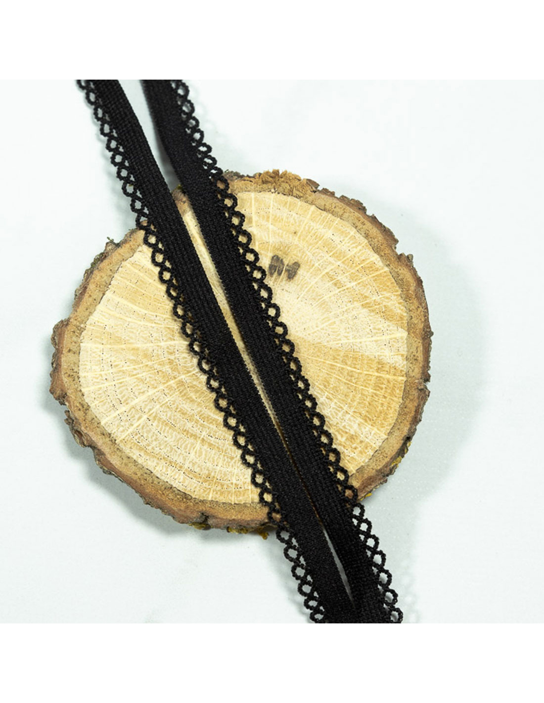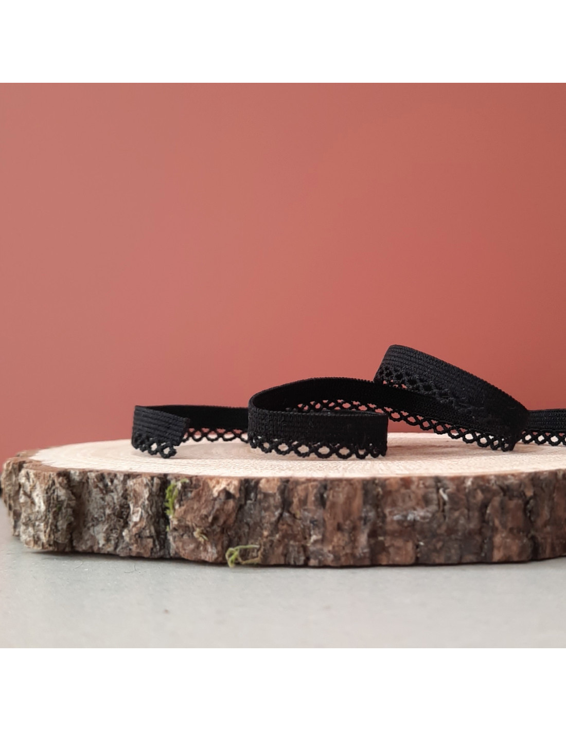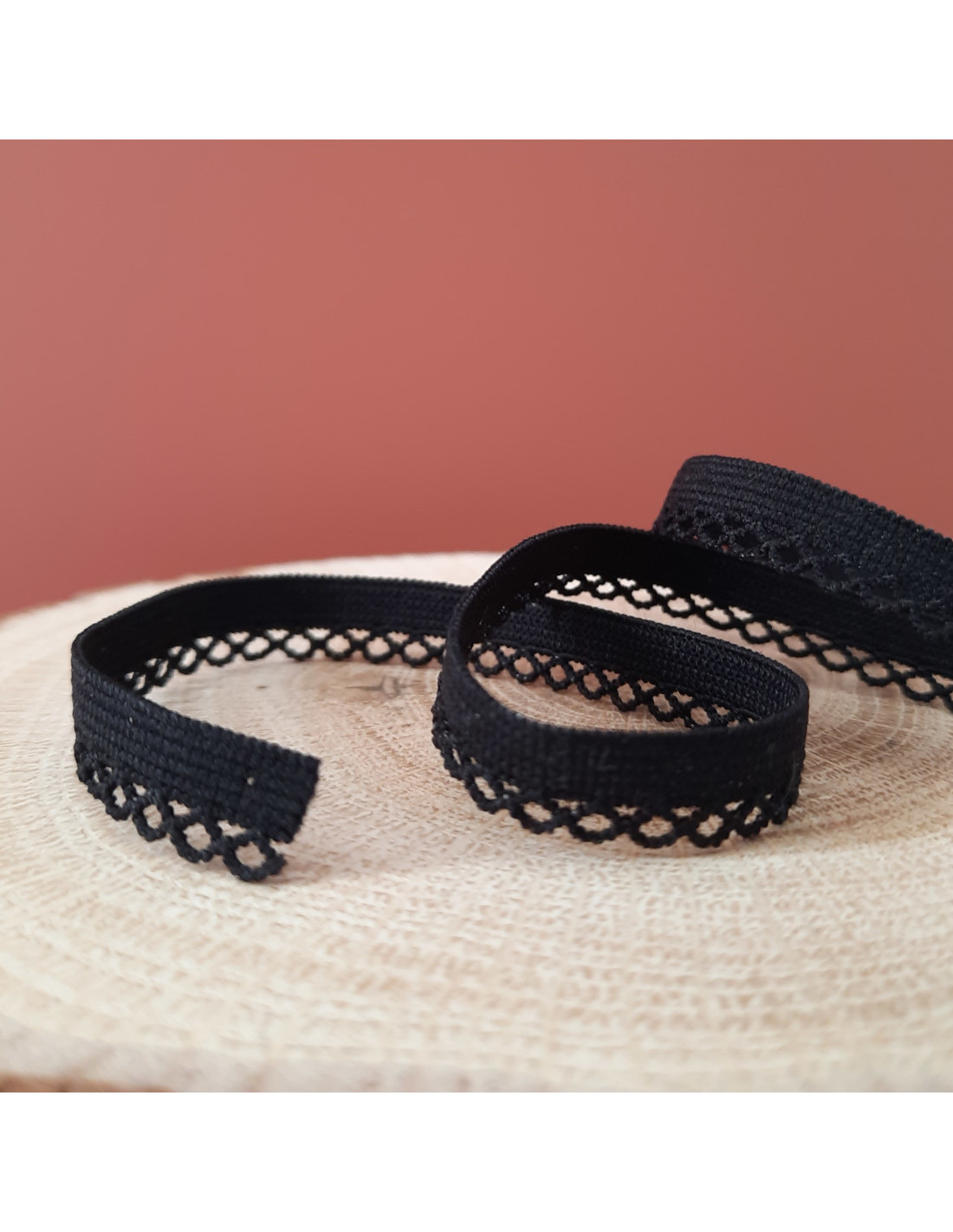 Elastique festonné de 1cm de large avec une belle élasticité (environ 70%), noir. Une jolie bordure dentellée vient finir le bord.