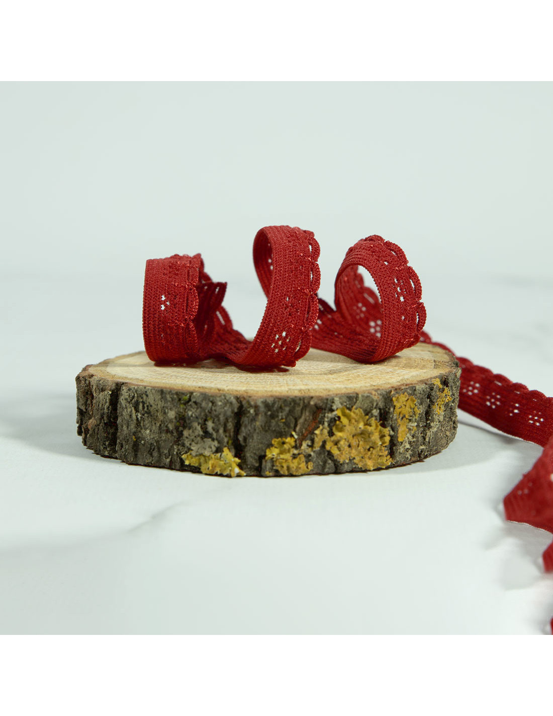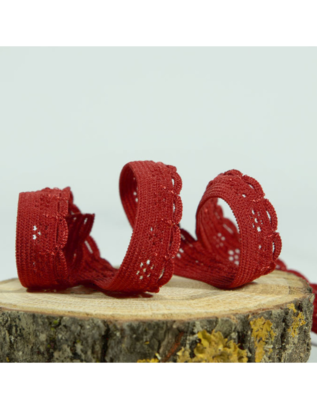 Elastique festonné de 1cm de large avec une belle élasticité (environ 70%), rouge foncé, avec une légère note de marron. De jolis festons dentelés viennent border le côté.