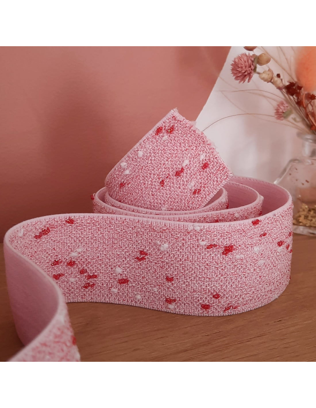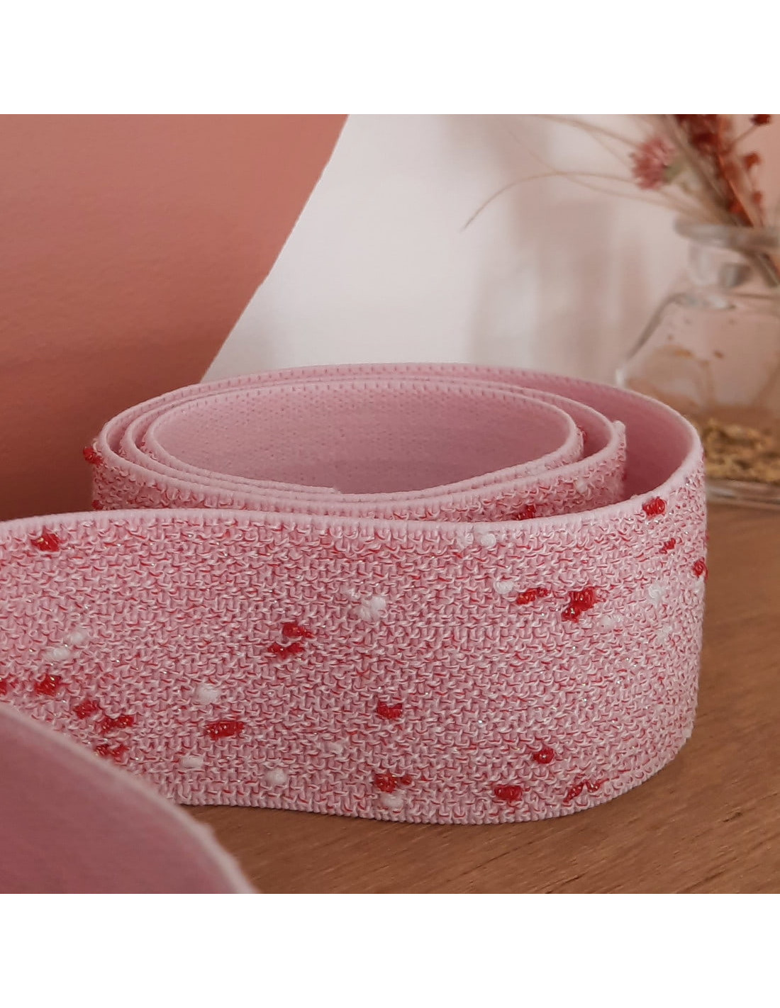 Très bel élastique fantaisie de 4 cm de large, aux discrets fils de lurex rouge, lui apportant une légère brillance. Rose et doux à l'intérieur, de quoi sublimer la ceinture d'un jogging, boxer, jupe à taille élastiquée ou tout autre vêtement où l'élastique doit être visible ! Souple, bonne rétractation après étirement.