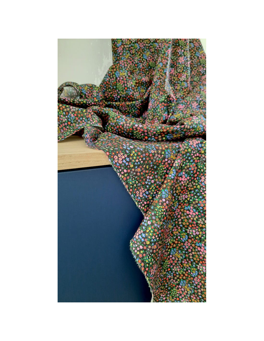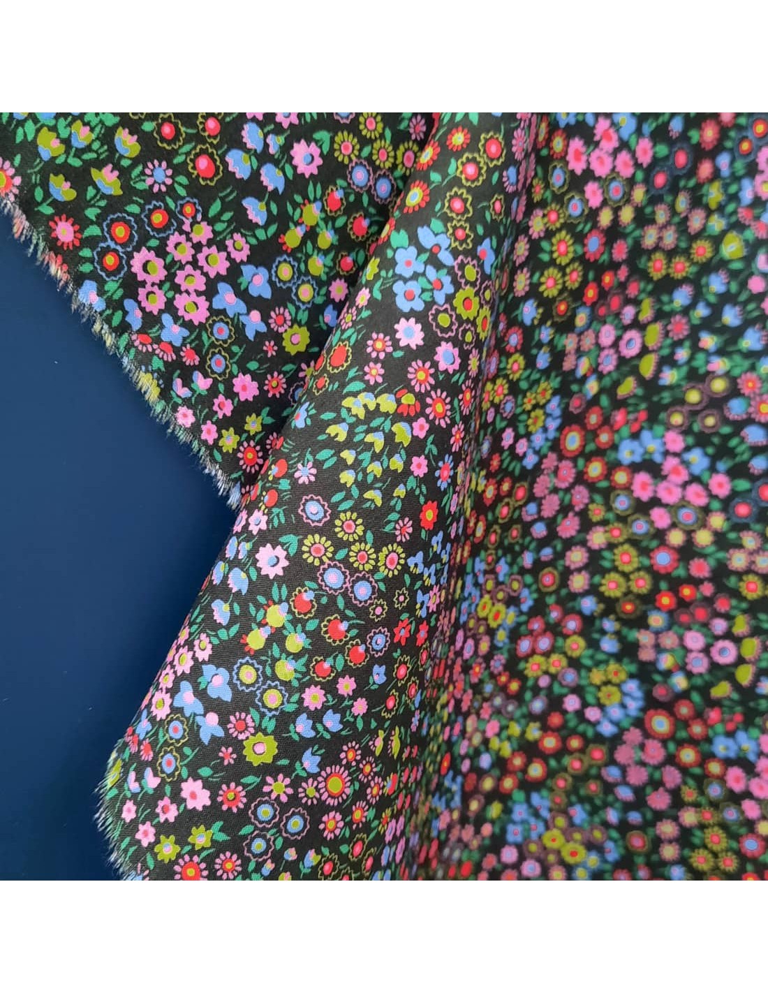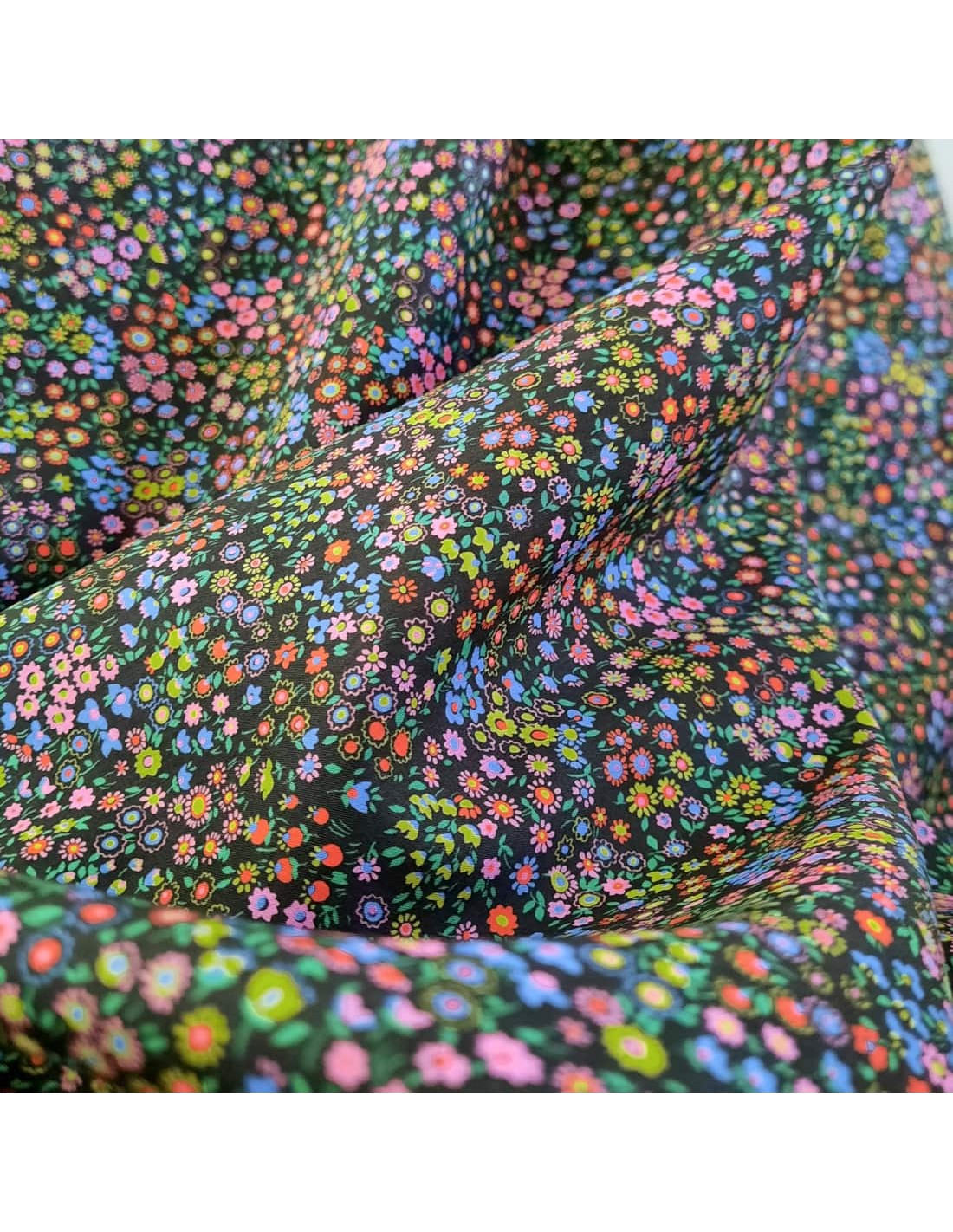 Voici Cooper dance, une douce batiste de coton aux petites fleurs multicolores, sur fond noir. Largeur des fleurs : environ 0,5cm.