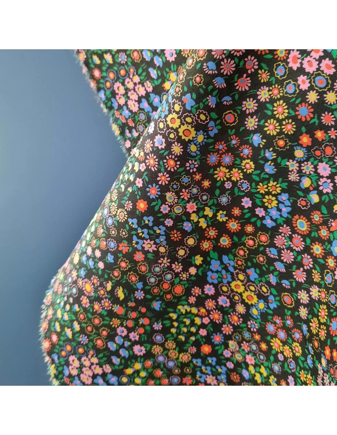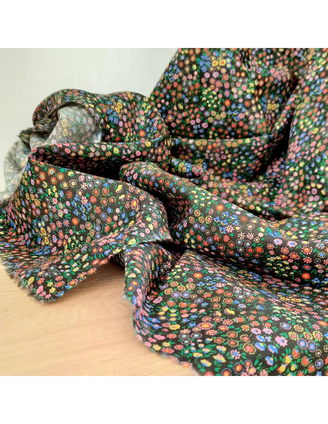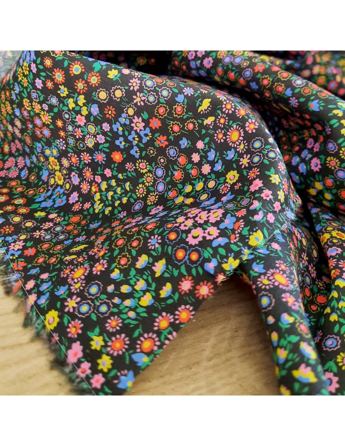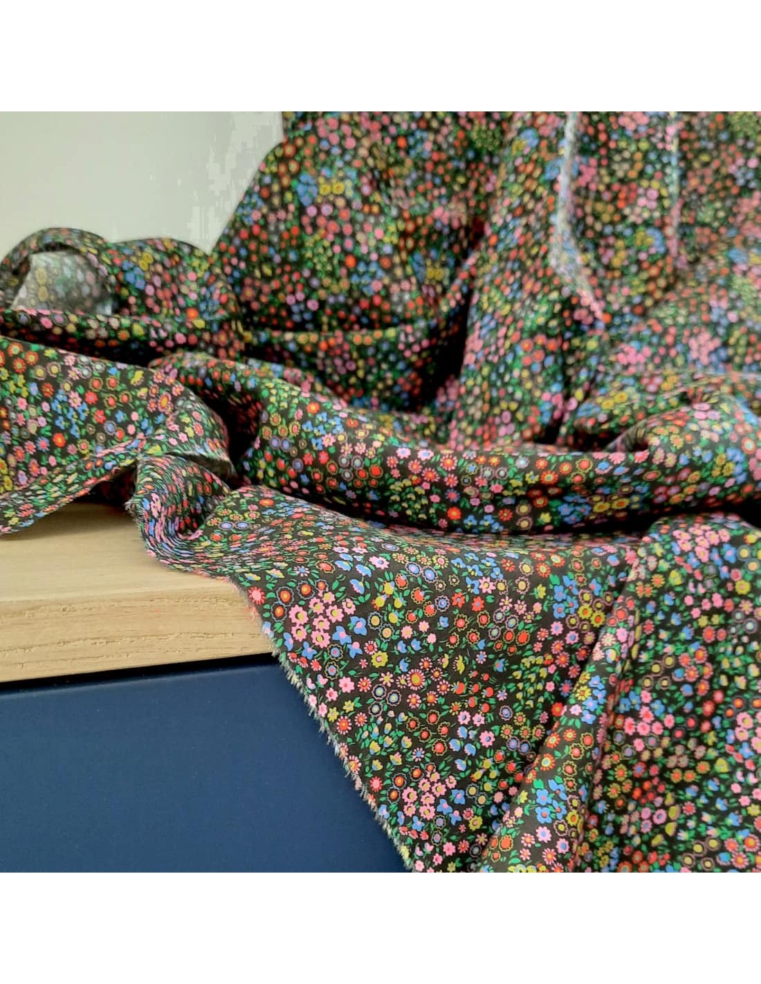 Voici Cooper dance, une douce batiste de coton aux petites fleurs multicolores, sur fond noir. Largeur des fleurs : environ 0,5cm.