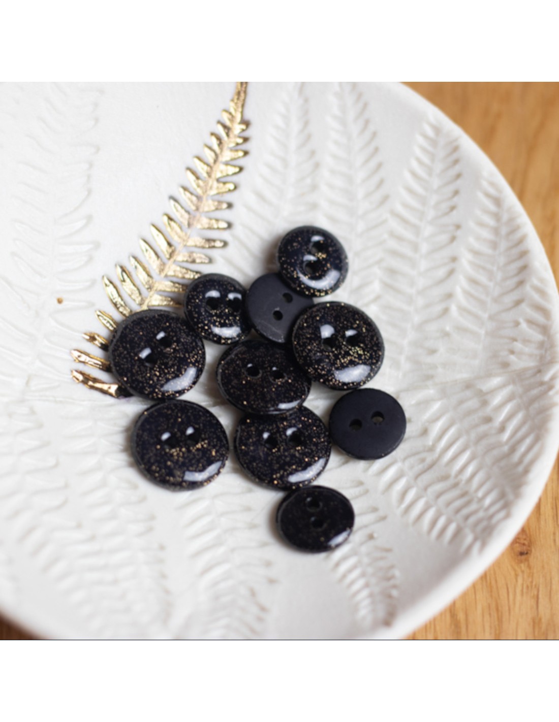 Coloris noir, aux paillettes dorées. Les paillettes sont directement intégrées à l’enduit qui recouvre la nacre afin que le bouton conserve un aspect lisse et un fini miroir. Cela évite le touché rugueux des boutons recouverts de paillettes sur la face extérieure.