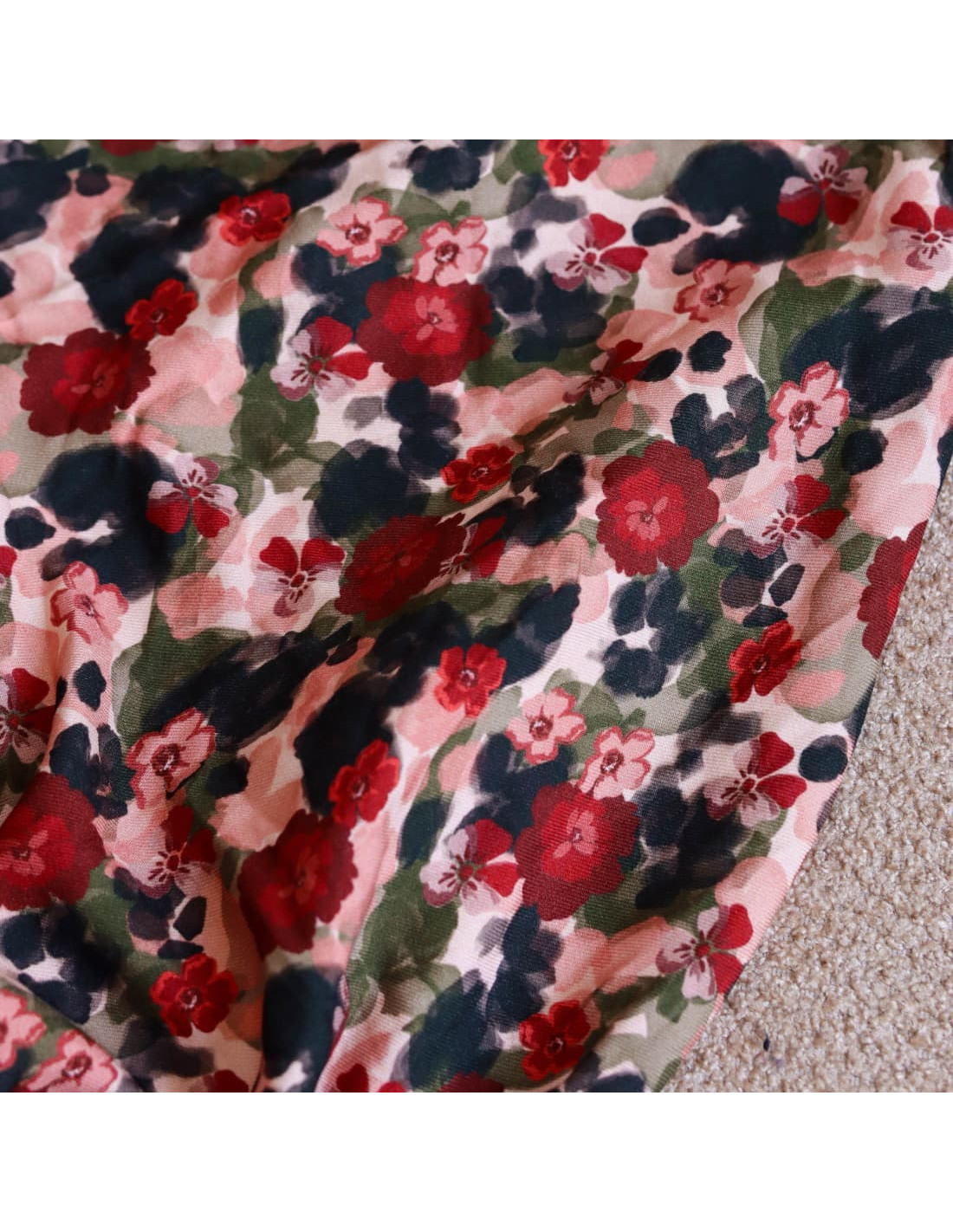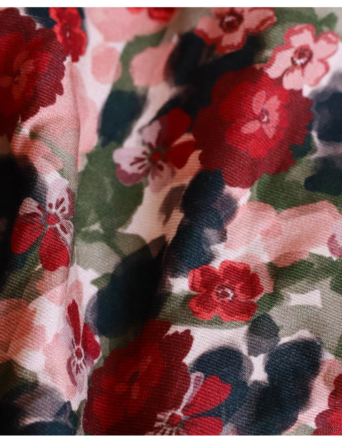 Issu de la collection No rain no flowers, Flower drips est un sergé de viscose au superbe drapé souple, sans être trop fin. Il est sublimé par son motif floral bordeaux et rose, réhaussé par des touches de kaki et de noir. Comme des pétales encore perlés d’eau, glissant doucement après l’averse.