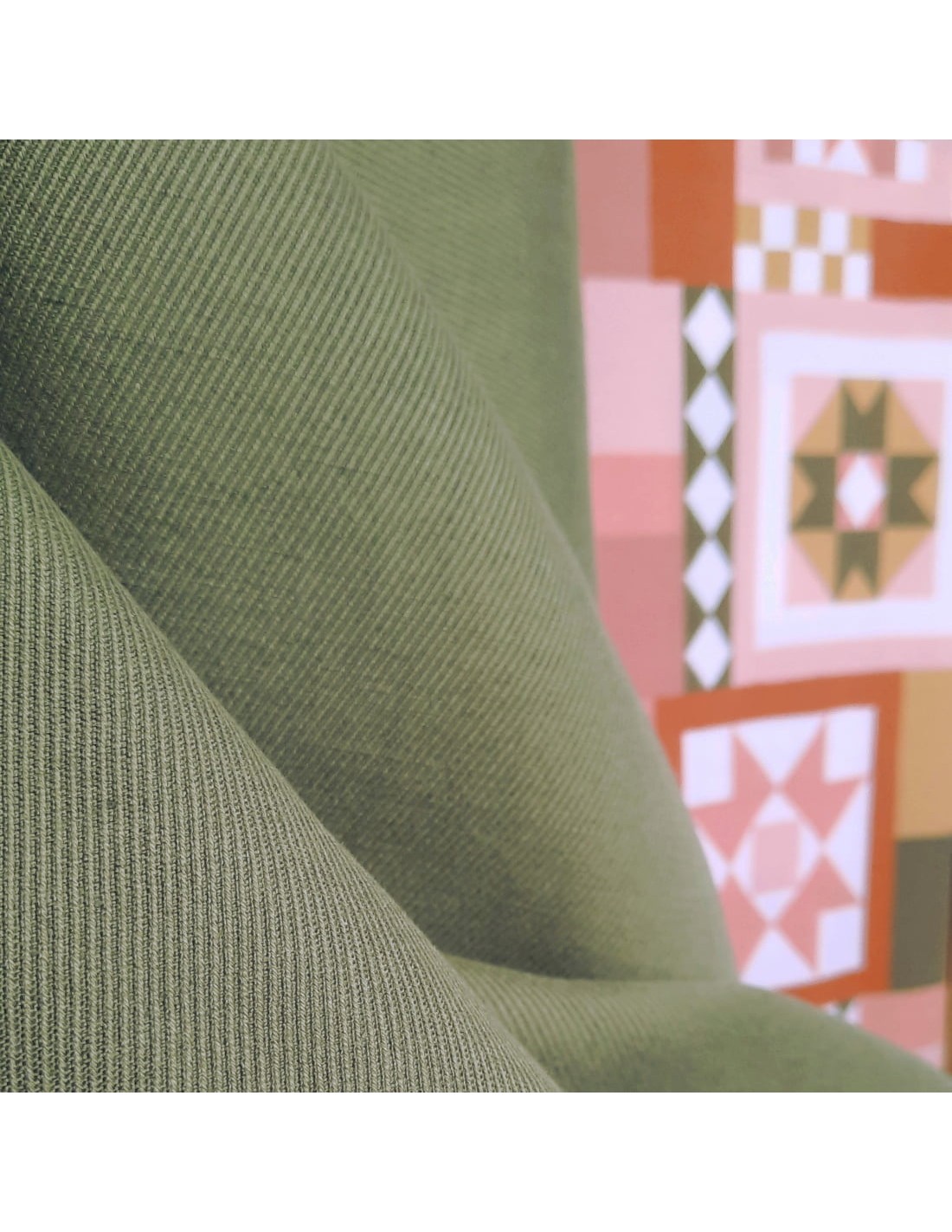 J'ai choisi ce Twill coton/lin pour coudre un pantalon taille haute. Sa couleur correspond parfaitement au visuel. Il se froisse très peu. Il sera mon pantalon d'été ! Très confortable j'adore le rendu je recommande ce tissu !