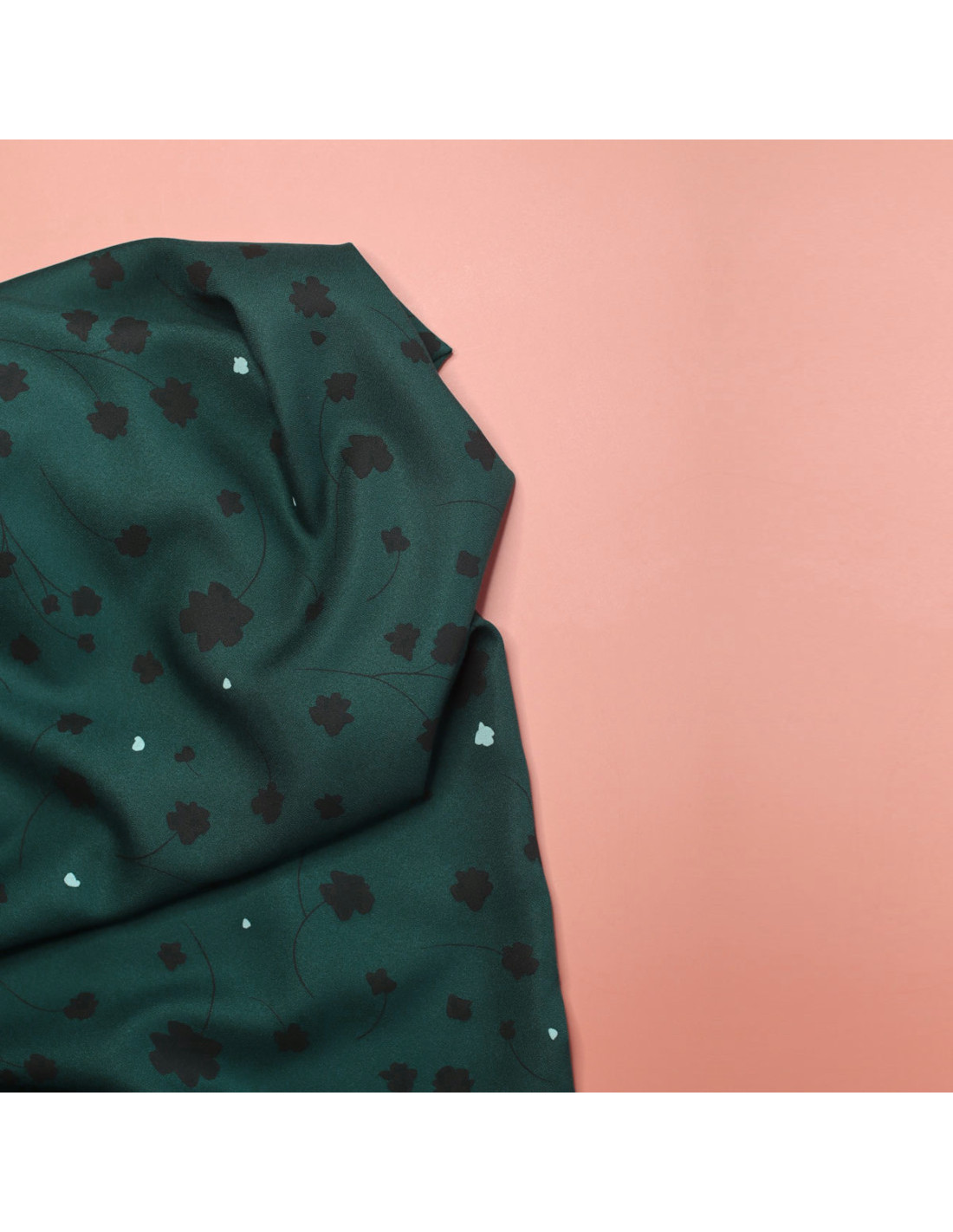 Aérien et fluide, ce crêpe de viscose est reconnaissable par son tissage texturé, dû à la forte torsion des fils qui le composent, lui apportant un certain relief poudré. Des fleurs noires apparaissent discretement sur un fond vert profond, réhaussé de petites touches de bleu clair.