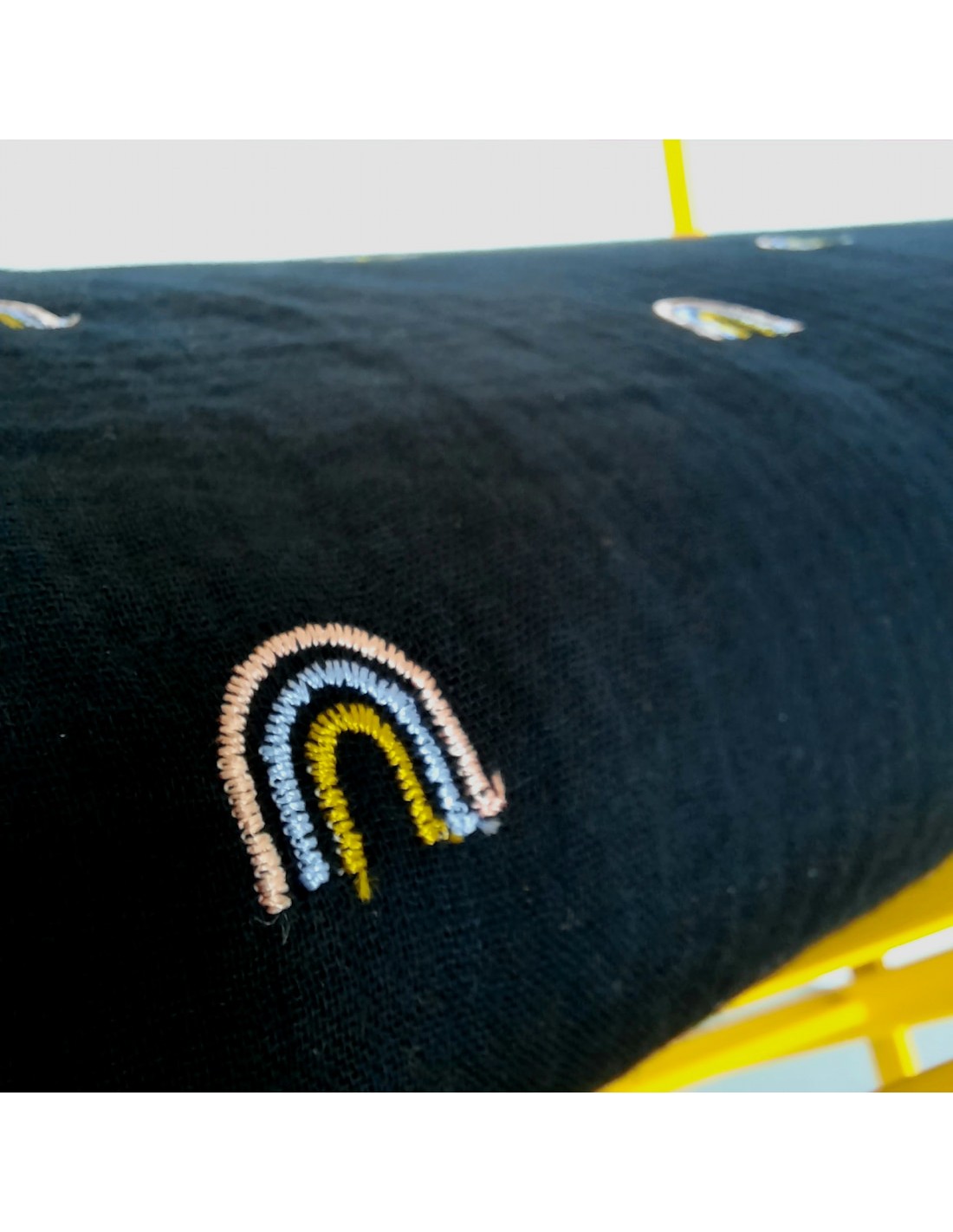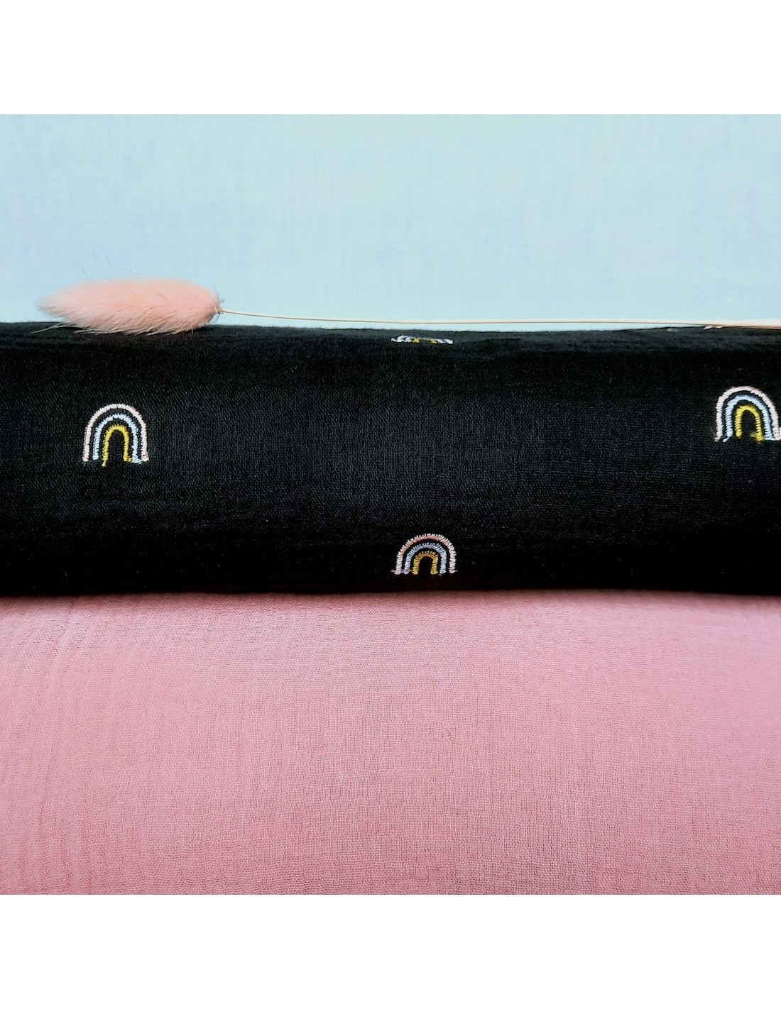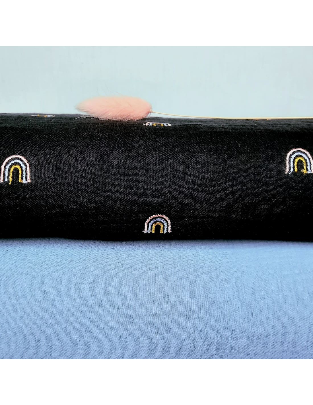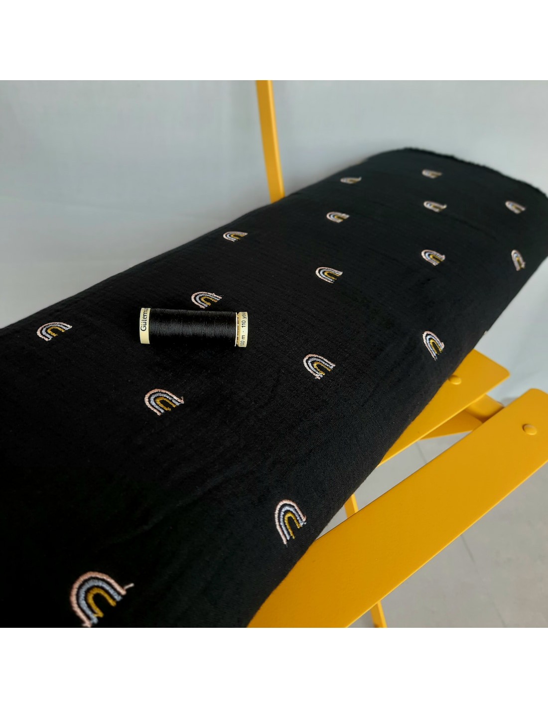 Double gaze 100% coton, avec de délicats arcs-en-ciel brodés sur fond noir. Absorbante, légère et gonflante, la double gaze possède un tissage particulièrement aéré, qui en fait un précieux allié pour l'été. Son relief gaufré, donné par l'assemblage des deux couches de gaze entre-elles et ses motifs brodés la rendent super craquante !
