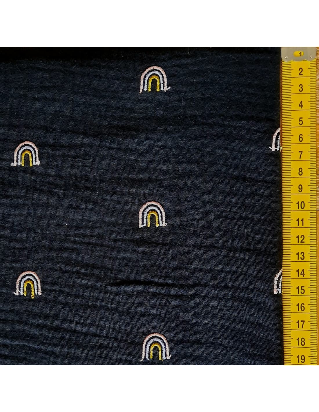 Double gaze de coton, arcs-en-ciel brodés, noir (coupons)