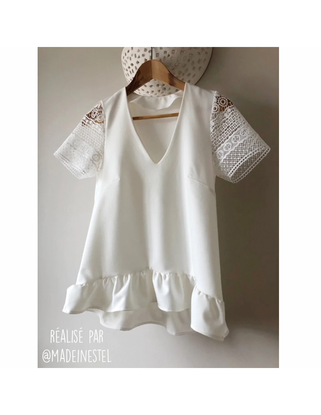 "Délice est une belle robe d’été à la forme délicate, ornée d’un volant qui vient souligner la silhouette. Un empiècement en dentelle peut être ajouté au niveau du col en V. J’adore le fait d’avoir le choix entre des manches courtes ou bien de petits volants, avec ou sans, c’est au choix ! La robe Délice est aussi déclinable en jolie blouse au bas asymétrique ornée d’un volant plus large."