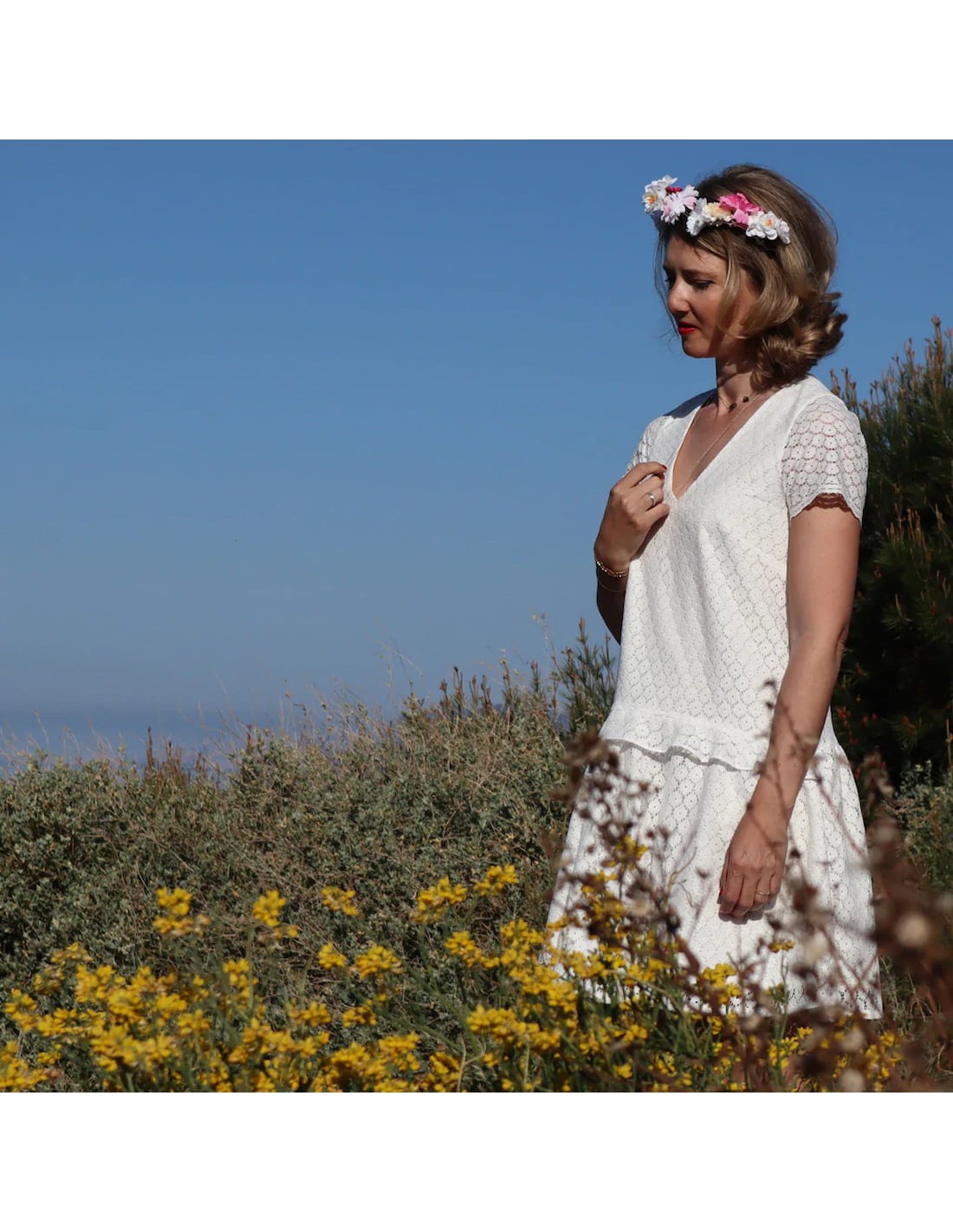 Nous vous conseillons d'utiliser un tissu souple et léger de type chambray, broderie anglaise, seersucker, double gaze, plumetis/toile de viscose, etc. Une version doublée est également présentée pour réaliser le modèle en dentelle.