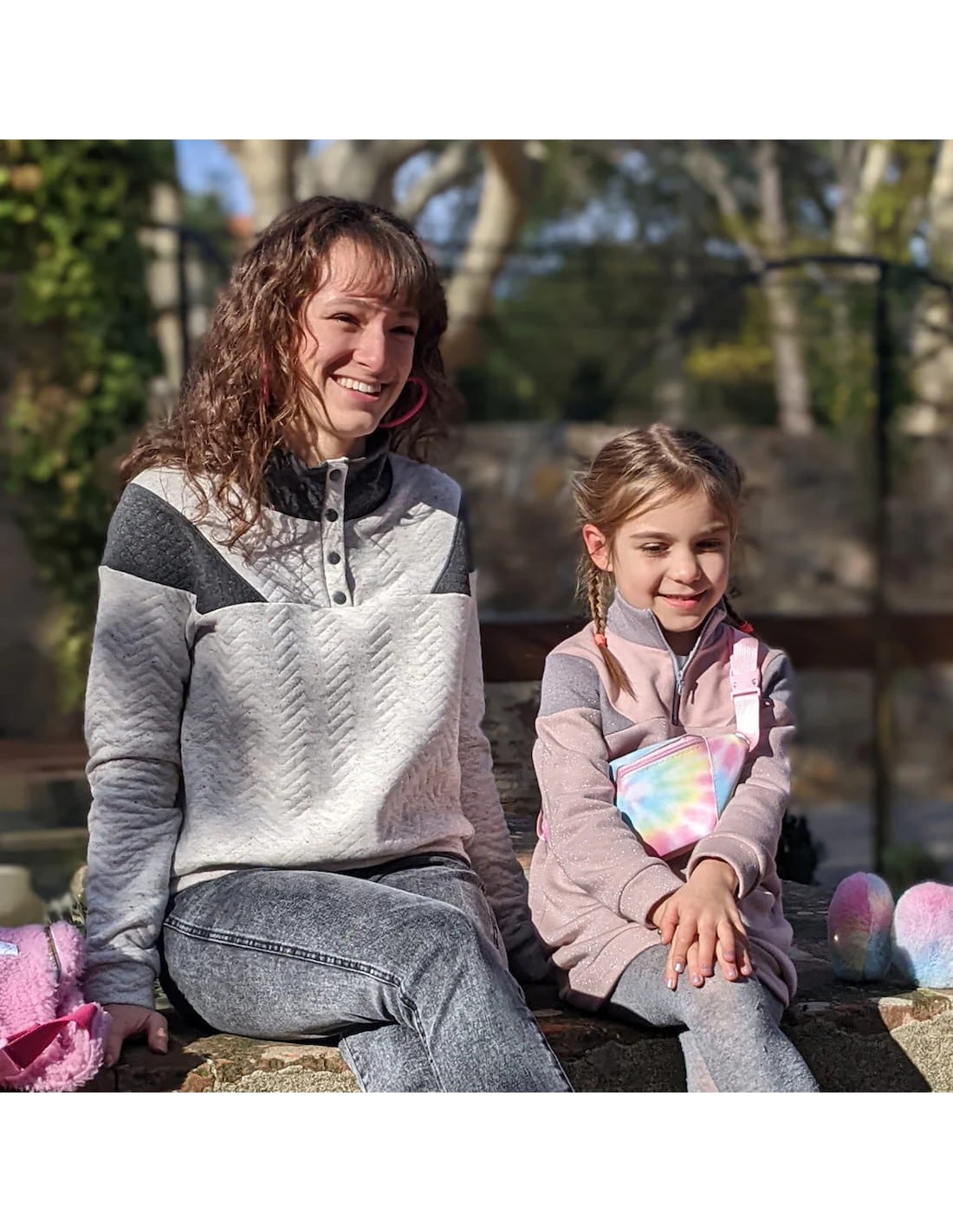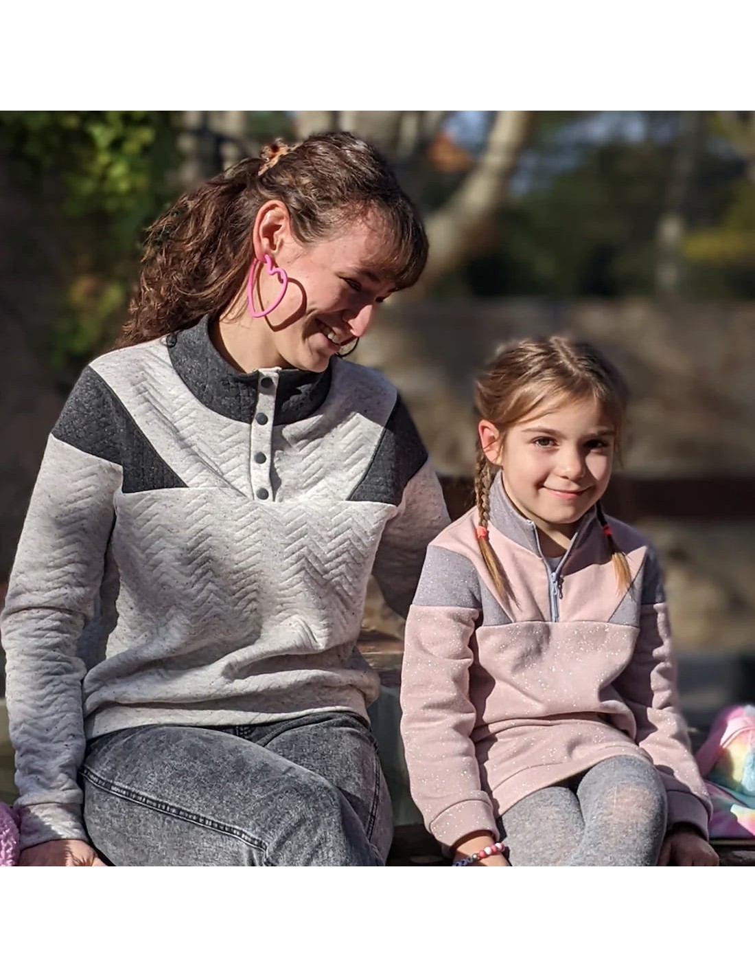 Il peut se coudre en version pull ou robe, possède des manches permettant de s’amuser avec les couleurs et les matières et offre le choix entre plusieurs options de col :